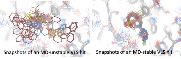 Refining a virtual screening hitlist with molecular dynamics (MD) simulations can be highly beneficial, particularly when assessing the stability and realistic binding behavior of candidate compounds in complex with the target. While initial docking provides a static snapshot of ligand-protein interactions, MD allows for the exploration of dynamic, time-dependent effects, such as conformational flexibility and solvent effects, which are crucial for accurate binding predictions. Through MD, we can observe how ligands adjust within the binding pocket, monitor changes in the protein's structure, and detect transient interactions that might be missed in docking alone. By refining the hitlist with MD, we can prioritize compounds that not only bind well in static models but also exhibit sustained interactions in a more realistic, fluctuating environment. This extra layer of validation helps improve the reliability of hitlist rankings and reduce the risk of advancing false positives in drug discovery. To run use the script runMDopenMM which is in /bin directory of the ICM distribution.