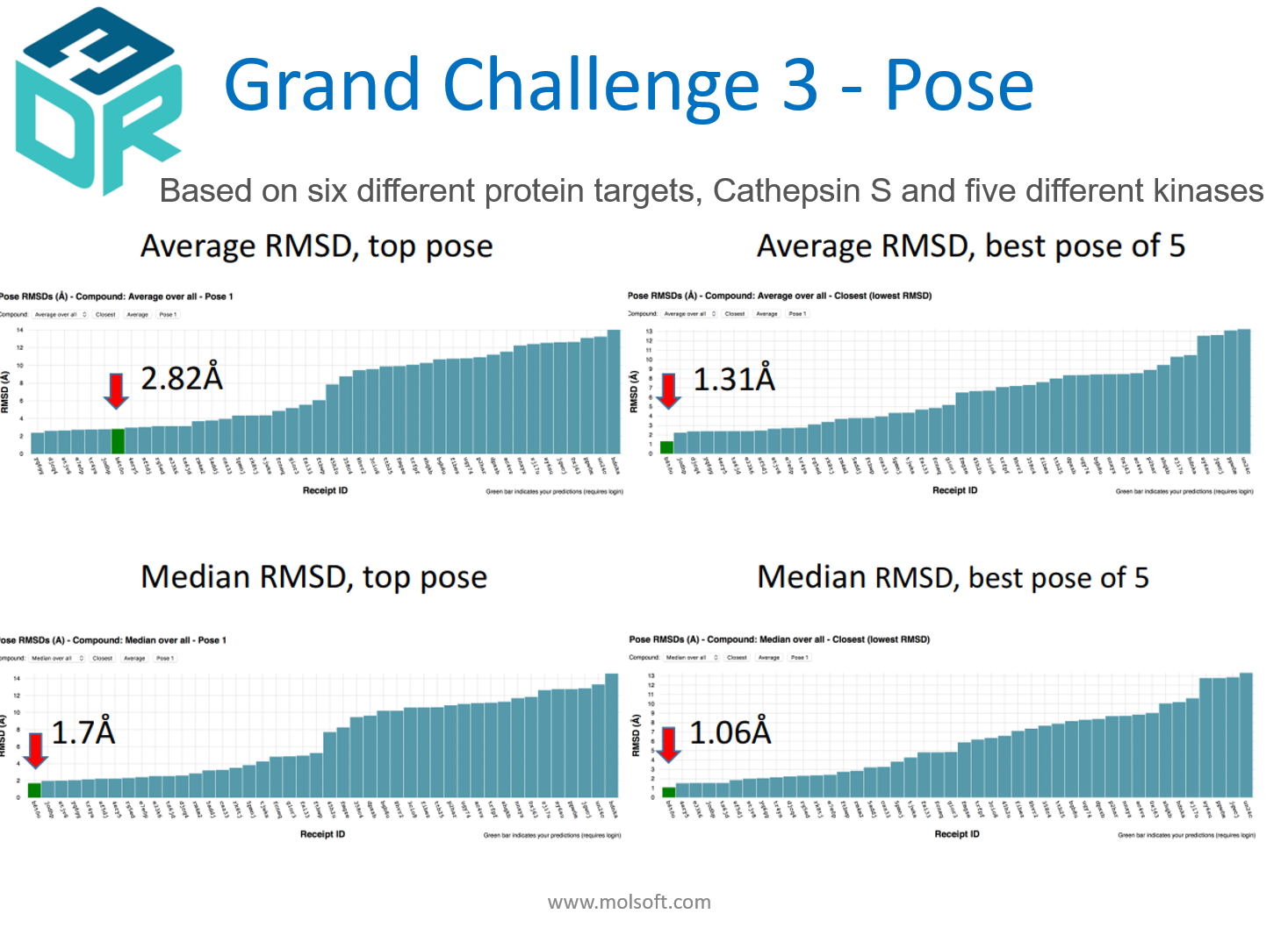 In January 2017 the organizers (D3R) distributed the evaluation results which showed that MolSoft's submission ranked first in RMSD for the top scoring pose and was the only one with average RMSD below 2.0A (Figure 1 below). In the Binding Energy Prediction competition ICM APF dock and icm-MMGBSA method ranked in first place and produced the lowest RMSE for Stage 2 Set 1 set of Kd values for 15 ligands (Lam et al 2018).