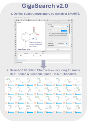 GigaSearch v2.0 enables interactive similarity and substructure searching across libraries containing billions to hundreds of billions of compounds. Optimized fingerprints and statistical pruning allow queries to complete in seconds, with direct integration into ICM-Pro workflows.