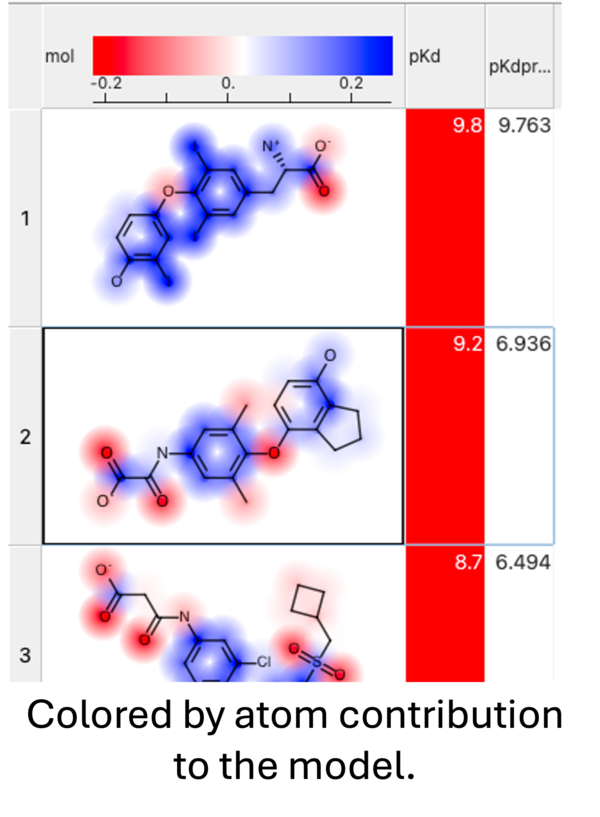 When you run the prediction you will see an option to color by atom contribution. This will color the atoms in the prediction results from negative (red) to positive (blue) based on their contribution weight (w column - see above) to the modek.