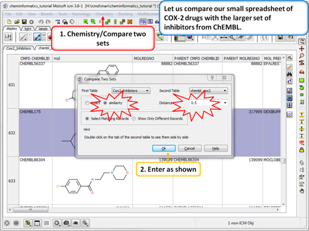This tutorial follows on from the previous tutorial where we made a database of COX-2 inhibtors (Cox2_Inhibitors) and read in a chemical spreadsheet containing IC50 data from ChEMBL (chembl_cox2). In this tutorial we will perform chemical spreadsheet comparison and explore some of the chemical search options inside ICM.