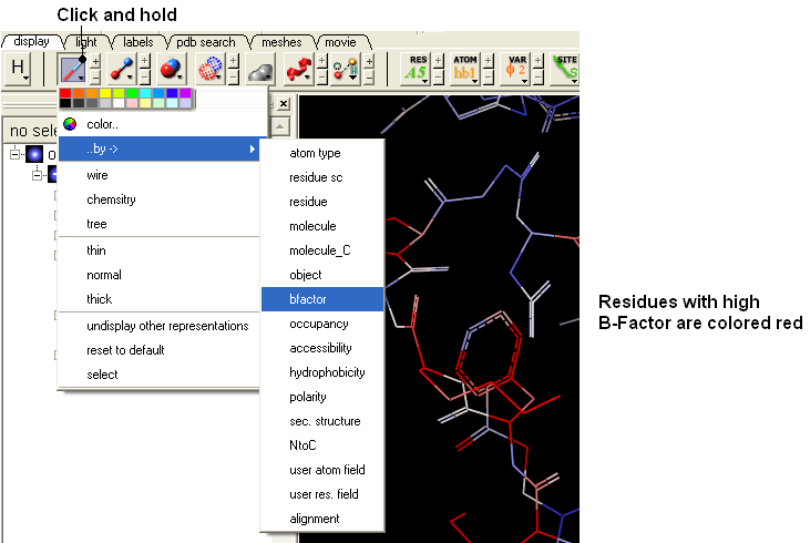 Background When preparing a PDB for analysis (eg docking or modeling) it is important to check the reported occupancies and b-factors. The occupancy is a fraction of atomic density at a given center. If there are two equally occupied conformers both will have an occupancy of 0.5 - the normal value is 1 range 0-1. The *{B-Factor} is the mean-square displacement of atom from its position in the model - the normal range is 5-50. One way of visualizing the occupancy and b-factor is by coloring the structure by these values. You can do this by clicking and holding on a representation button in the display panel and selecting Color-by. As an example let us look at the crystal structure 1ATP