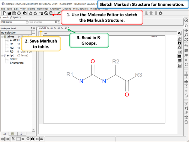 | Enumeration Setup A pre-prepared example is available in File/Open Examples > example_enum.icb. The markush structure has already been drawn and the R-groups have been read into ICM. The Markush structure is prepared for enumeration.