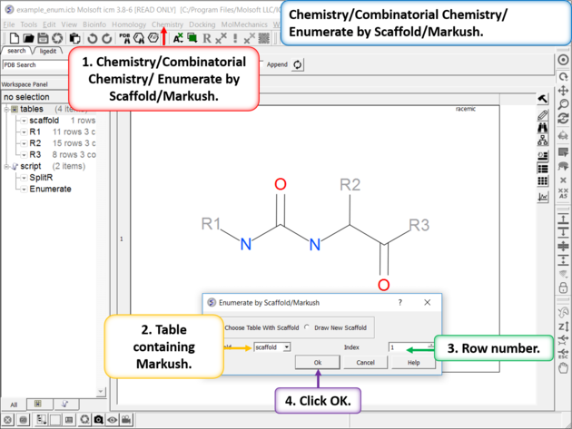 | Enumerate Library - Step 1: Choose the menu option Chemistry/Combinatorial Chemistry/ Enumerate by Scaffold/Markush.