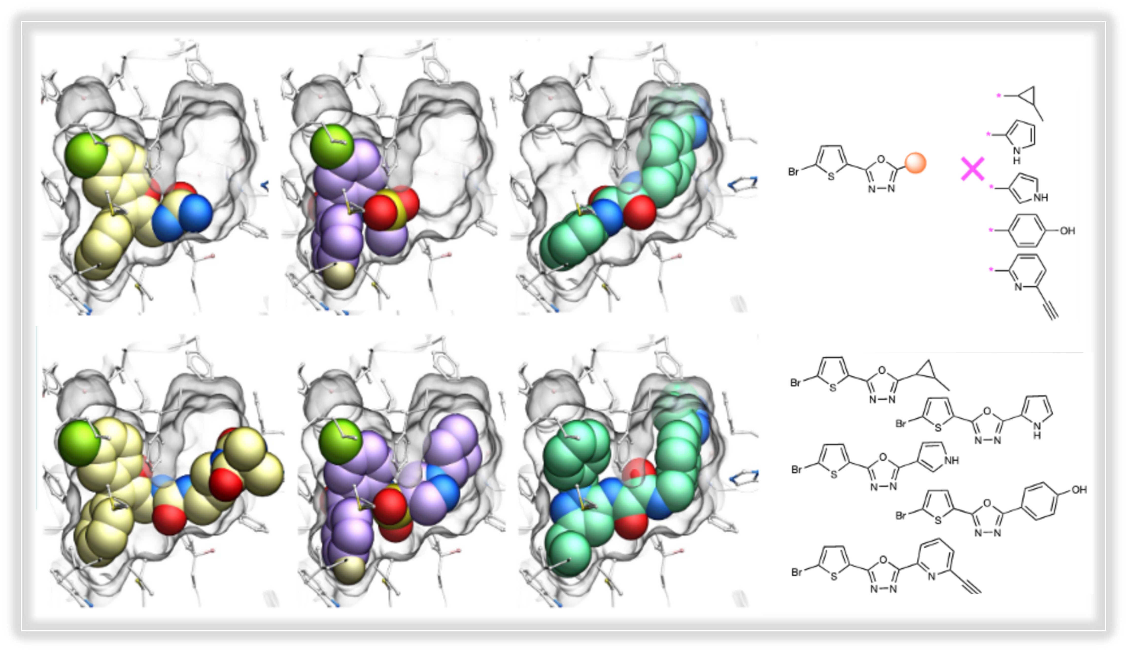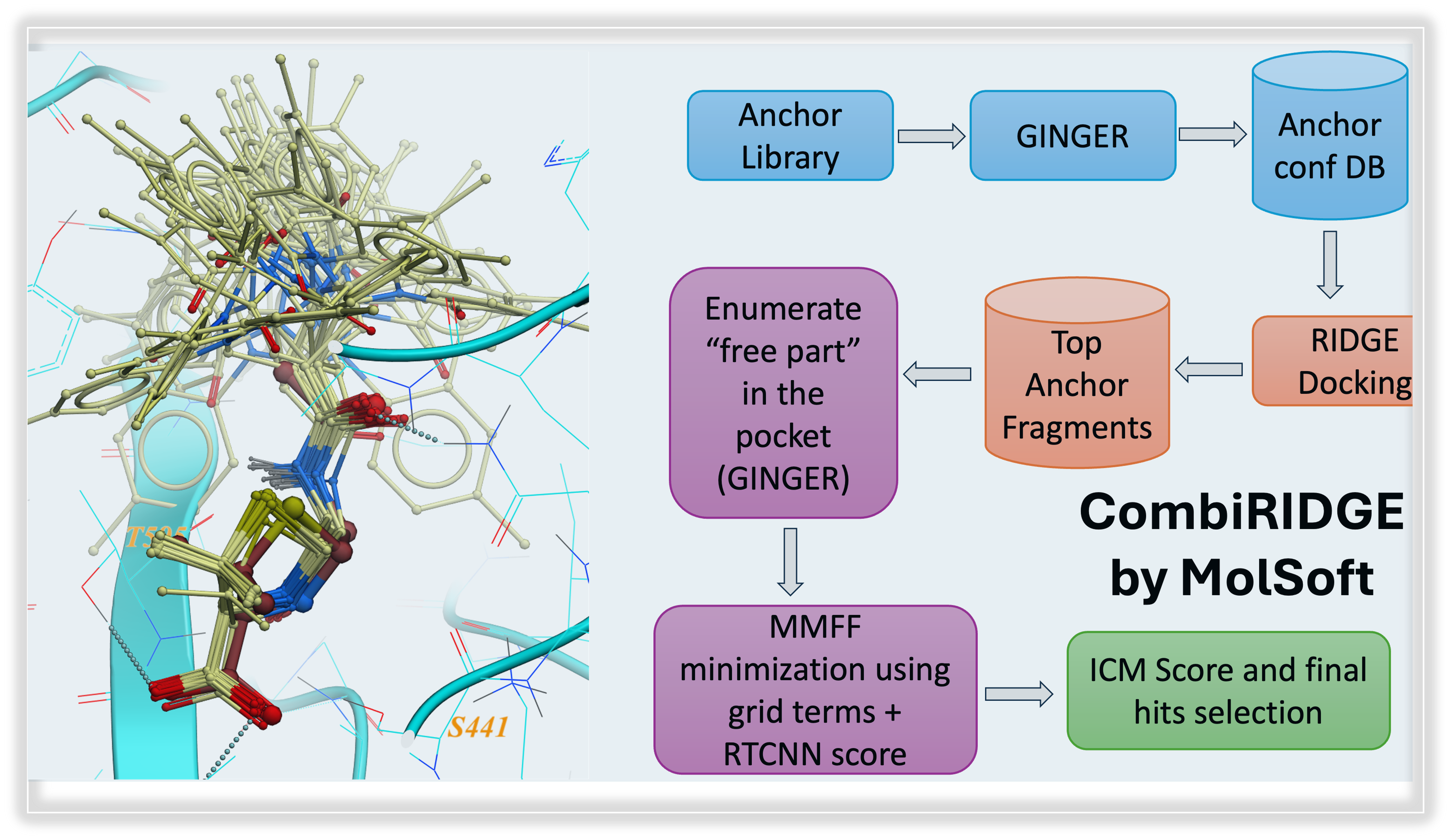 - CombiRIDGE - CombiRIDGE rapidly screens combinatorial libraries by growing core fragments with diverse R-groups and ranking them using AI-based scoring.