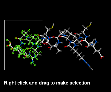 Selections can be made on the sequence of the peptide. This can be done by expanding the sequence display in the ICM Workspace and clicking and dragging on the sequence as shown below. Non-contiguous selections can be made by clicking/dragging over the sequence whilst holding down the Ctrl key.