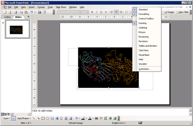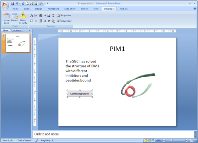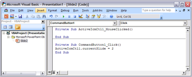 It is possible to write simple VisualBasic scripts to avoid having to use the right-click menu approach to changing activeICM control slides within the control itself. This allows one to place buttons outside of the activeICM control, but in the same PowerPoint slide, which controls the control's behaviour. Below are a couple of useful examples of this approach. Creating a button to set the control's active slide: Insert a button Office 2003