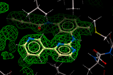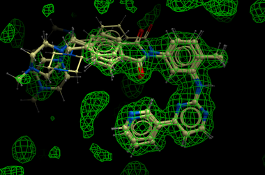 In the figure shown below the interaction between Gleevec and Syk kinase is shown. The white carbon atoms are the published ligand pose and the yellow carbon ligand is the result of ICM which gives a better fit to the density.