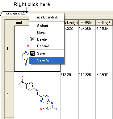 There are a variety of ways to save chemical structures. Chemicals can be saved in mol, sdf and smiles format from a chemical table (spreadsheet), molecular editor or from the ICM-Workspace. An image of the 2D sketch can be saved as an image from a chemical table.