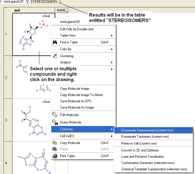 Enatiomers are distinguished based on the Latin terms for left (sinister) and right (rectus). In some cases where the handedness is unknown a chiral center can be labeled "RS"or unknown. To enumerate and display in a separate table the stereoisomers of selected compounds.