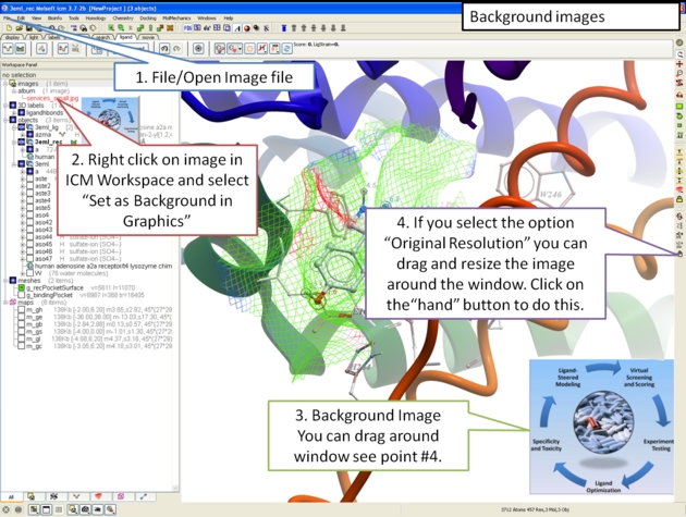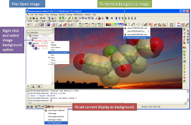 A background image can be added to the graphical display. This can be useful for making cool images or for comparing structures (e.g.compare displayed object with background image of object).