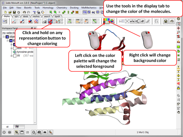 - Select the atoms, residues, molecules, or objects you wish to color in the graphical display or in the ICM Workspace.