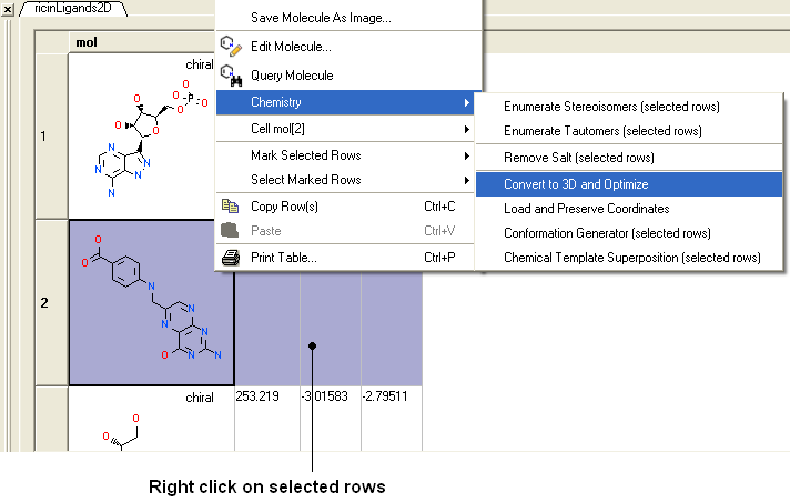To convert a chemical structure from 2D to 3D: There are three ways in which to do this depending on whether you have a chemical in a chemical table or in the ICM workspace. From the Chemistry/Convert/2D to 3D option menu option - convert a chemical in a chemical table.