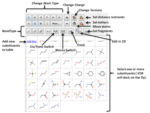 The default set of modifiers LIGAND.modifiers is just an sarray of smiles and it is hard-coded into ICM. You can add your own groups by clicking on the "Add New" button in the editor http://www.molsoft.com/gui/edit-ligand.html When sketching you need to add an attachment point - right click on the attachment point atom in the 2D editor and select attachment point. You can also add manually through the command line: LIGAND.userModifiers = LIGAND.userModifiers // "c1[c*]nc(N)s1" write system preference