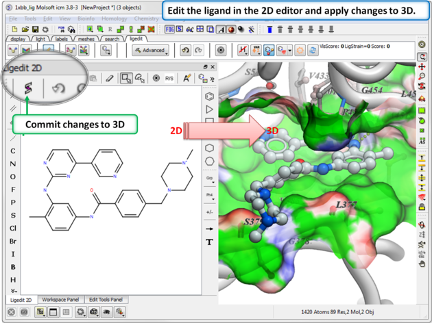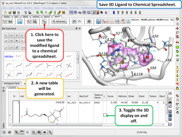 If you like a particular ligand and want to save the changes for use later, then you can save the 3D ligand to a chemical spreadsheet. You can then double click on the ligand in the spreadsheet to load it back into the editor or toggle the ligand on or off. To save to a chemical spreadsheet: