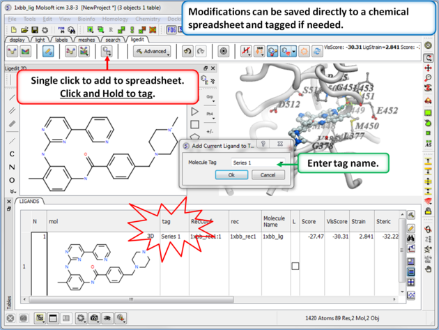 You can also tag a chemical with a unique name which is stored in the spreadsheet. To do this click and hold on the "Add Current Ligand to Table" button and enter a tag name. The ligand table can be grouped by this tag column (Right Click on the column and choose "Group View By").