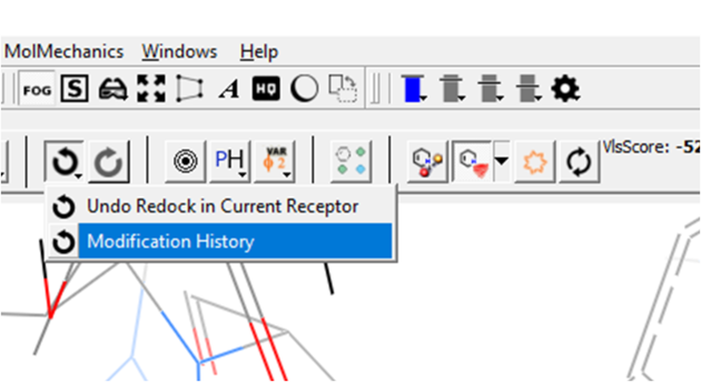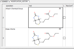 You can view a table with a log of all modifications by clicking and holding on the "undo" button and choose "Modification history". This will produce a chemical table with a column (operation) describing the modification. Double click to load the modification into the receptor or use the "L" column to toggle the display on and off.