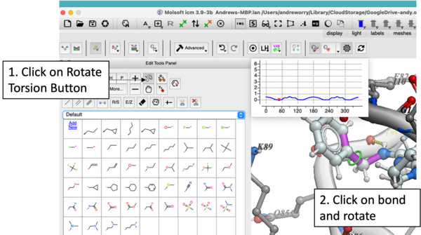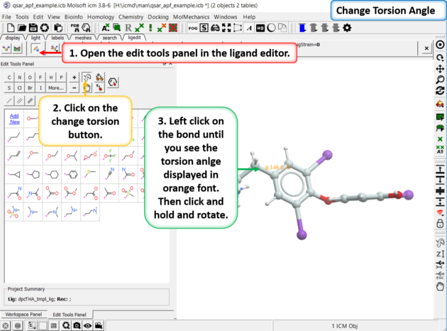 To manually change torsion angles - click on the torsion angle button in the Edit Tools Panel. Click on the bond you want to rotate until you see the torsion angle displayed in orange font. Then click and hold and rotate the torsion.