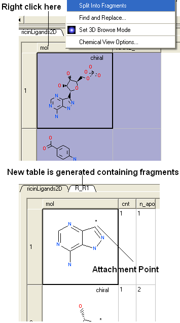 Chemicals displayed in an ICM Molecular Table can be split into fragments. This is useful for generating a series of R-groups to be added to a scaffold (See section describing reactions.