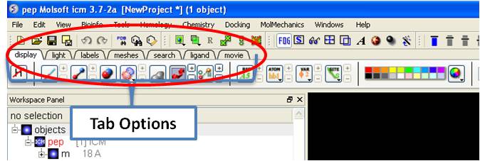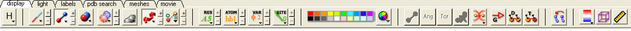 The display tab contains tools for a variety of functions including - structural representations, coloring, labeling and superposition. This tab is shown below.