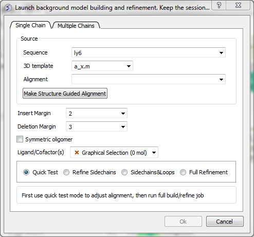 - First use Quick Test to check the model and make any necessary adjustments to the alignment. When you are happy, proceed to refine-side chains, or refine side-chains and loops, or full refinement.