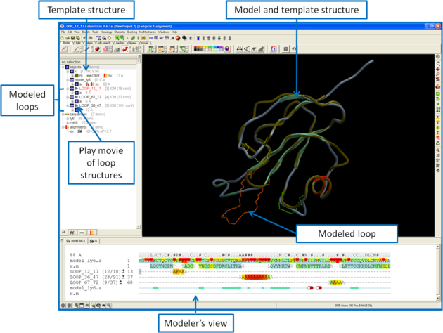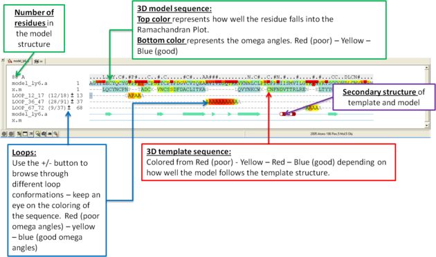 You can browse a number of different loop conformations by clicking on the +/- button next to the loop in the modeler view's window. Keep an eye on the colors of the loop residues in the alignment - they are colored red (poor) -yellow - blue (good) depending on how good the omega angles are. The residues in the loops are represented by Alanines for every residue other than Glycine or Proline.