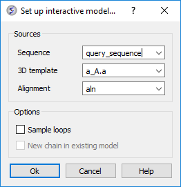 - First make an initial model of query sequence based on A.pdb and setup the modeler's view alignment (Homology/Multi-Template Model Editor/Setup from Sequence and Template). Enter the data as shown below and click OK.