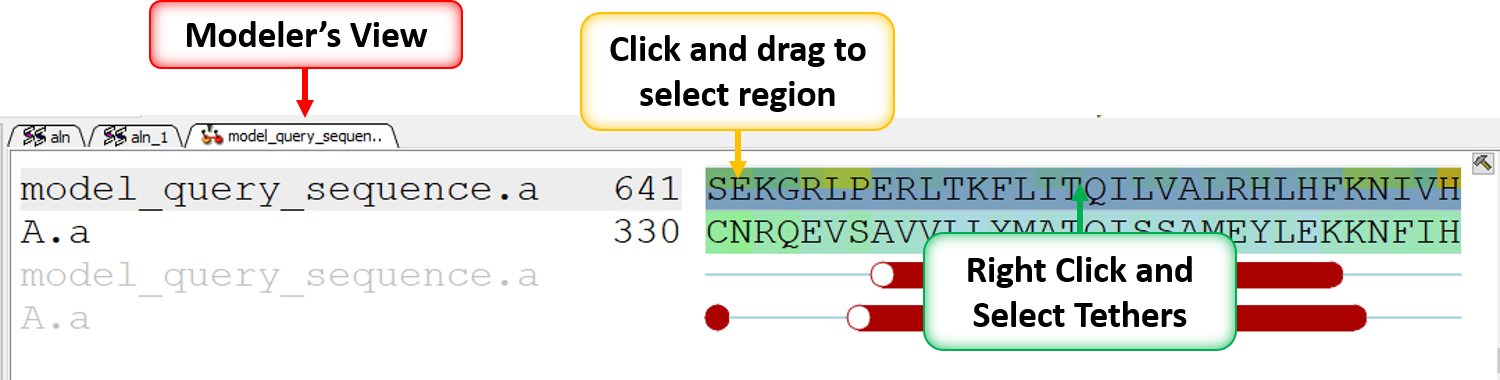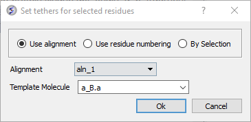 - Right click on the alignment selection and choose "Set Tethers". Choose "Use alignment" option and then select the alignment of query vs B.pdb and the template structure B.pdb in the drop down window Click OK.