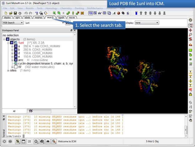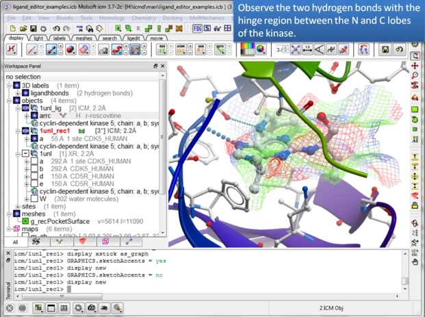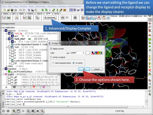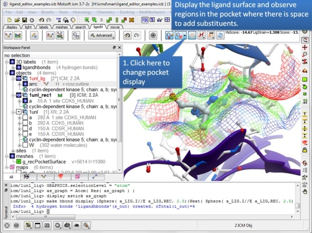 In this example we will use the 3D interactive editor to modify a cyclin-dependent kinase 5 inhibitor (PDB Code 1UNL). A hydrophobic cavity not occupied by the crystal structure ligand (roscovitine) can be exploited to improve the interaction between the ligand and the receptor. Roscovitine is an experimental drug candidate in the family of cyclin-dependent kinase (CDK) which preferentially inhibits multiple enzyme targets including CDK2, CDK7 and CDK9.