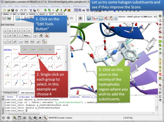 | Step 11: You can try any modification group you wish from the "edit tools panel". We will try some halogen substituents and see if they improve the score. |