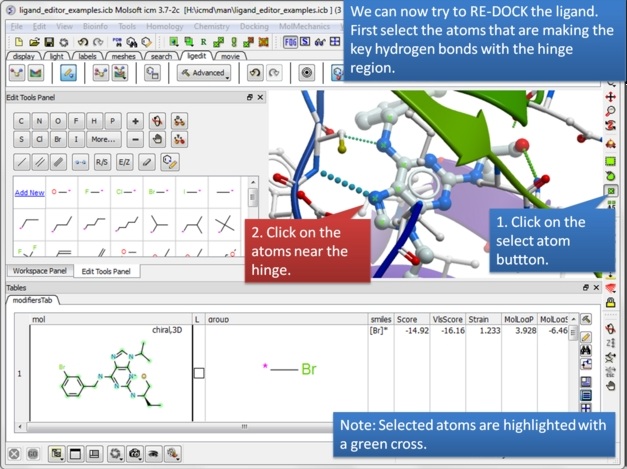 | Step 15: We can now re-dock this ligand to make sure the interactions are optimal. We must remember to tether the atoms making a hydrogen bond with the hinge and so first we must select these atoms. |