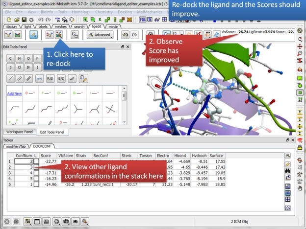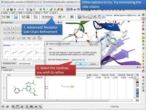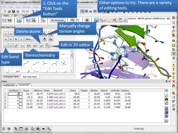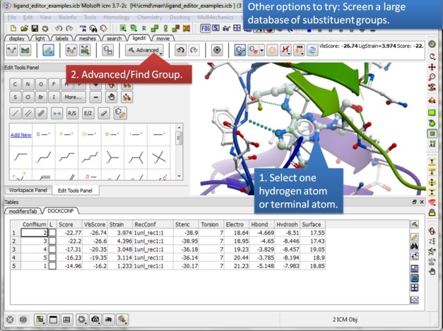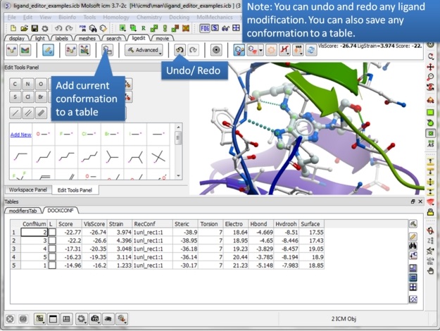 | Step 18: Never worry about modifying a ligand because everything is saved. Try anything you want because you can always undo and redo. There is also a convenient way of storing a modification you like in a a table. |