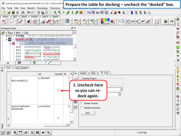 | Step 10: Prepare the table for docking by removing the check from the "docked" box in the chem table.