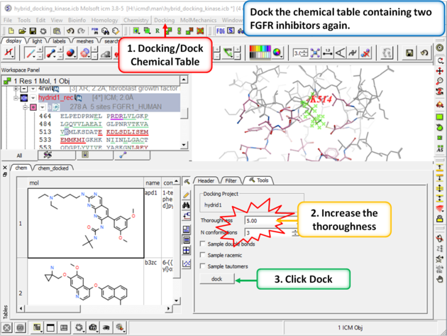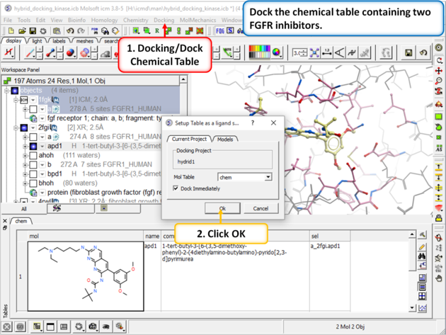 | Step 4: Dock the chemical table called "chem". This table contains two FGFR1 inhibitors from PDB 4RWL and 2FGI.