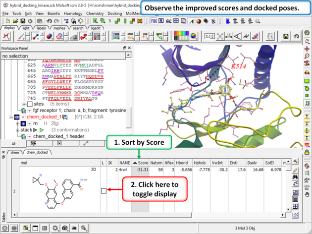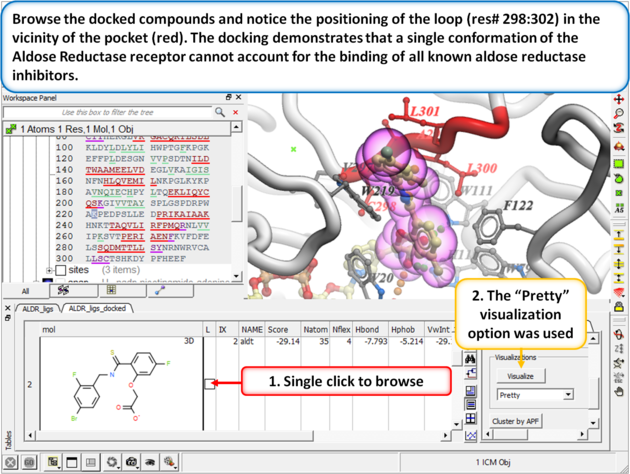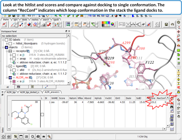 - You will see that the flexibility in the loop region is accounted for by multiple receptor conformation docking and therefore inhibitors which scored poorly in Step 4 now score well and the corresponding receptor loop conformation for a ligand is identified.