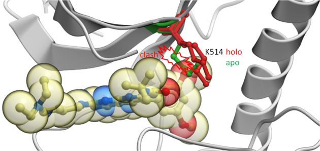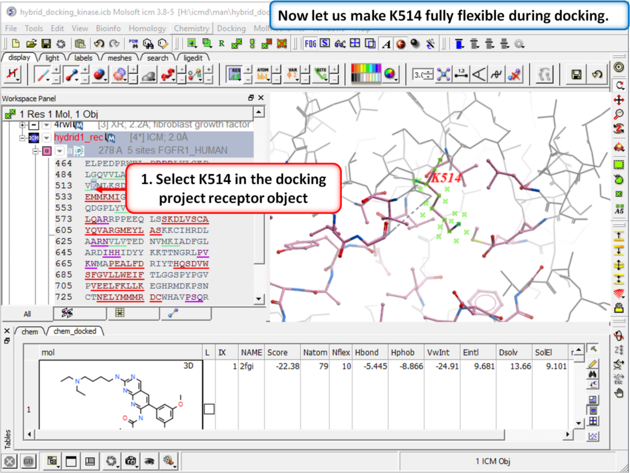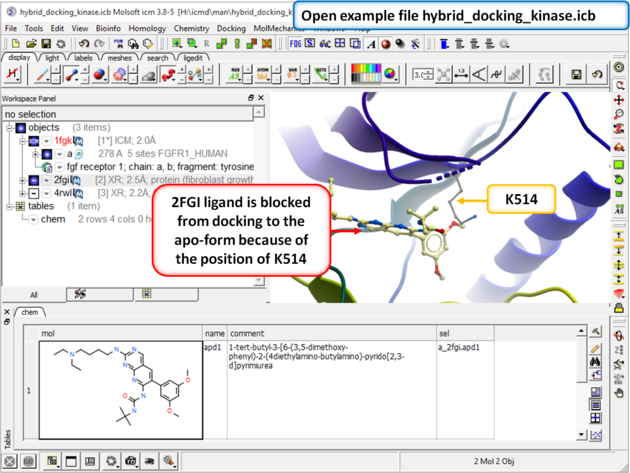 This example demonstrates how to keep certain residues as explicit during grid docking. Full side-chains or hydroxyls and water can be treated as flexible. In this example we look at some crystal structures of the tyrosine kinase domain of Fibroblast Growth Factor where we observe that inhibitors cannot be docked into the apo-form without a Lysine (K514) residue in the pocket being treated as flexible.