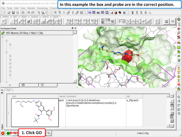 | Step 3: Setup the docking project using the ligand to guide the binding site. Double click on the ligand in the ICM Workspace and then select the Define Site Around Selected Ligand button (you should see green crosses surrounding the ligand on the receptor).