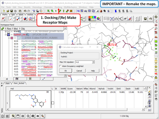 | Step 8: Remake the receptor maps (Docking/(Re) Make Receptor Maps).