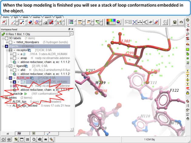 - Once the loop sampling has finished you will see the embedded stack in the receptor in the ICM workspace (see image below). The stack is ranked by energy and you can display a conformation by clicking on it in the ICM workspace
