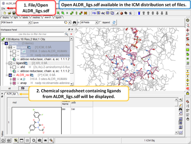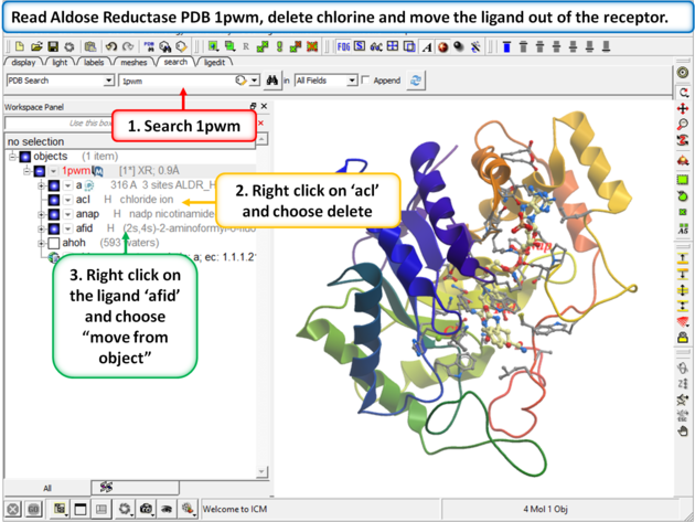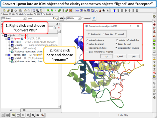 | Step 2: Convert 1pwm into an ICM object. * Rename the small molecule (fid) object "ligand" and the receptor object "receptor". You can rename an object by right clicking on the name of the object in the ICM Workspace and select rename. |