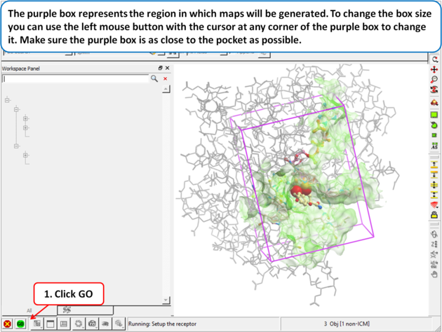 | Step 5: The purple box represents the region in which maps will be generated. To change the box size you can use the left mouse button with the cursor at any corner of the purple box to change it. Make sure the purple box is as close to the pocket as possible.