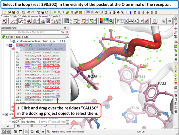 - Expand the sequence display for the ALDR_rec object in the ICM Workspace and select the loop region "CALLSC" (it is located towards the C-terminal). See screenshot below. You can select the region by clicking and dragging over the sequence in the ICM Workspace.
