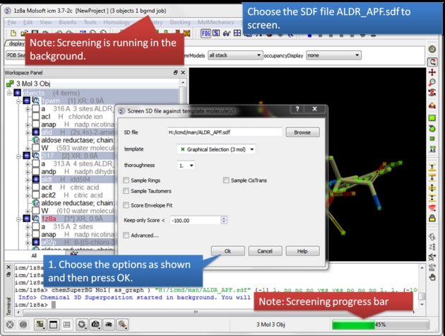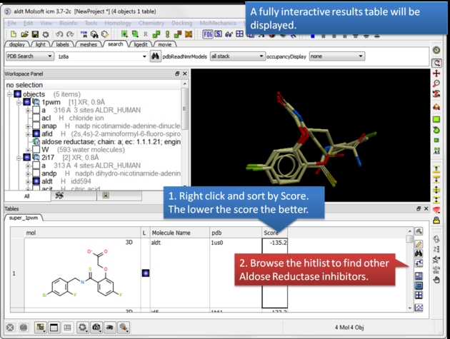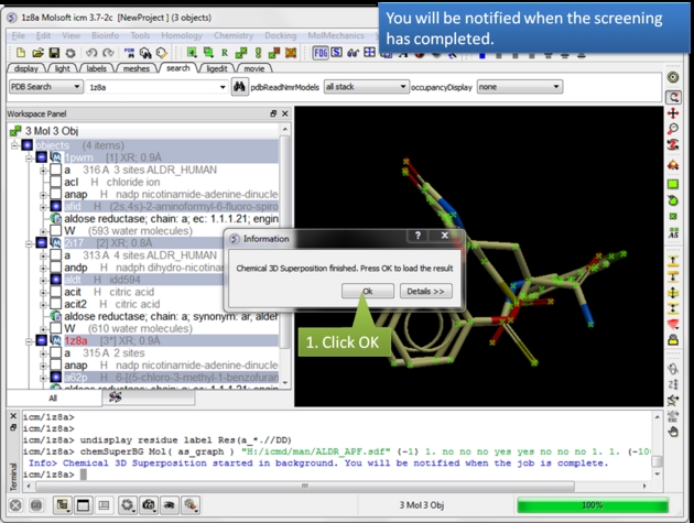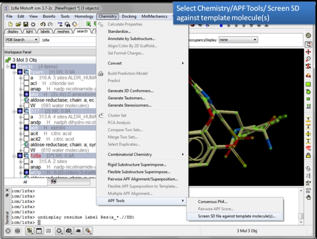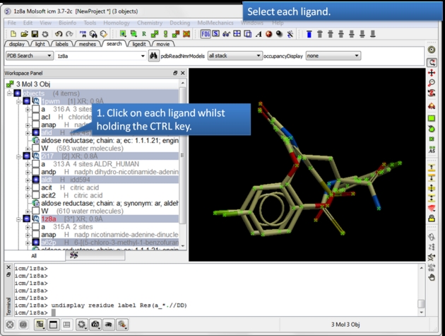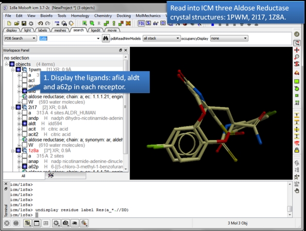 | Read in and display the superimposed template chemicals. In this example we will use three aldose reductase crystal structures 1PWM, 2I17, and 1Z8A. IMPORTANT: Convert each PDB file to an ICM object. |