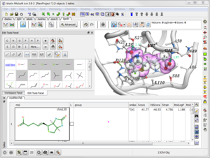 The ligand editor is a powerful tool for the interactive design of new lead compounds in 3D. It allows you to make modifications to the ligand and see the affect of the modification on the ligand binding energy and interaction with the receptor.