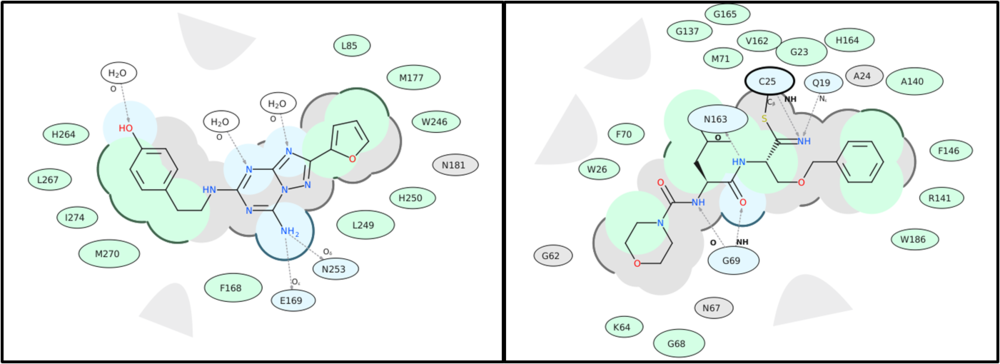 - 2D distance between residue label and ligand represents proximity.