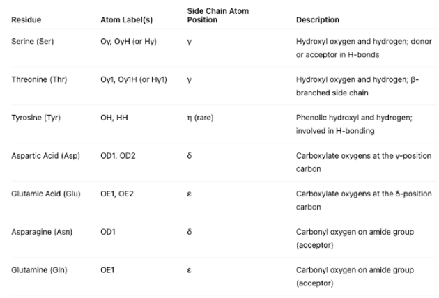 The plots also label side-chain oxygen atoms in amino acids that often participate in ligand-receptor interactions, particularly through hydrogen bonding or electrostatic contacts. The atom labels (e.g., Oγ, OD1) and their corresponding positions (using Greek notation) are frequently used in receptor-ligand diagrams to identify specific interaction sites and aid in interpreting hydrogen bond donors and acceptors within the binding pocket.