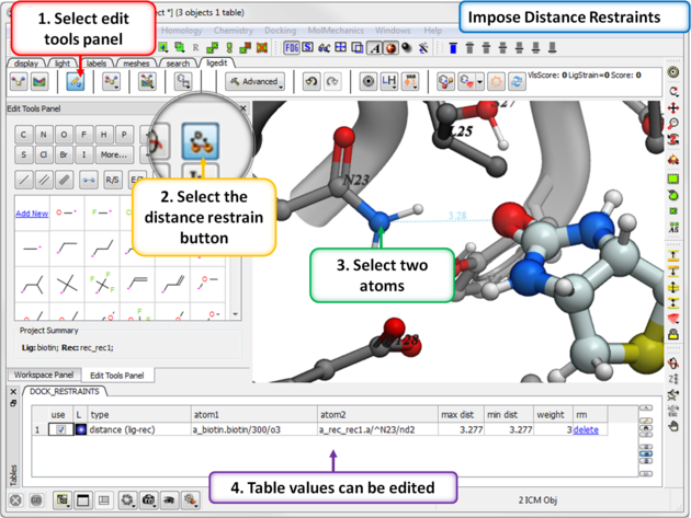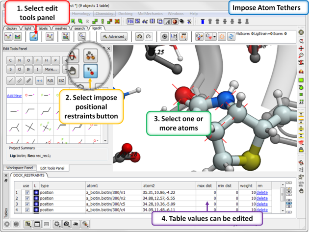 - A table detailing the distance restrints will be displayed and red crosses through the atom indicates a tether.