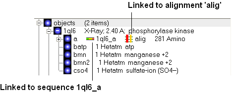 It is sometimes necessary to make links between sequences objects and alignments. A link enables you to make selections in one environment such as an alignment and then these selections are transfered to the object such as the PDB structure displayed. If a link is made then a symbol will be displayed next to the object in the ICM workspace. In the example shown below subunit_a of the X-ray structure 1ql6 is linked to the sequence 1ql6_a and the alignment called 'alig'.