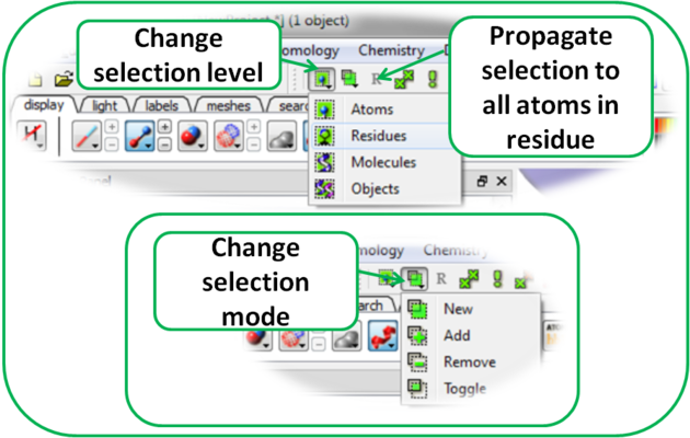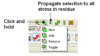 It is possible to change the level of selection before or during the building of a selection. The selection level drop-down button can be used to do this (see image below). For example, a C-alpha of a residue is selected but one would like to select all atoms in the residue. You can change the level to Residues. This selection can then be changed into all atoms of the residue by then selecting the Atoms level again. Or you can use the Propagate Selection to all Atoms button (see image below).