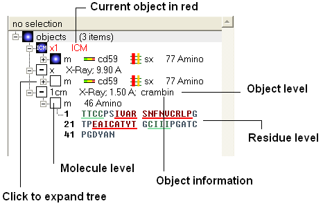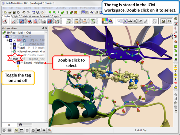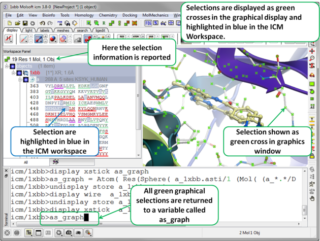 NOTE: The selection you have made is always recorded at the top of the ICM workplace. If you are familiar with using the ICM terminal (See language manual) the atoms, residues, molecules or objects selected interactively in the graphics window are automatically saved in the variable as_graph. Graphical selections are shown in green (crosses) or highlighted in blue in the ICM Workspace. <>